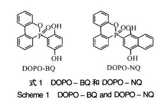 DOPO分子中的P——H键与对苯醌或1,4- 萘醌加成生成氢醌类阻燃O固化剂DOPO-BQ和DOPO-NQ(见式1)。由于刚硬的环状侧基DOPO结构的存在,DOPO-BQ阻燃的环氧树脂表现出较高的玻璃化温度和模量,比溴系阻燃剂TBBA阻燃的环氧树脂有更高的热稳定性。在酚醛型环氧树脂中,磷质量分数为1.1%时就可达到UL – 94 V – 0级;而溴系阻燃剂TBBA溴质量分数6%~13%,磷酸酯类阻燃剂BHPP磷质量分数2.2%时,才能达到相同阻燃效果。萘型阻燃剂DOPO-NQ由于具有更好的成炭性,与酚醛型环氧树脂的共聚物表现出更好的阻燃性。