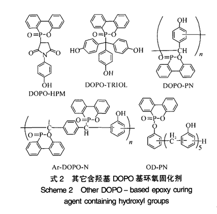 利用DOPO中P——H键的反应活性或DOPO的P——C1键衍生物,还可得到其他含酚羟基的环氧树脂固化剂(见式2)。
