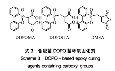 含酸酐结构的DOPO衍生物的合成,并用于环氧树脂的阻燃固化。DOPO与衣康酸加成然后脱水制得DMSA(见式3)。研究结果表明,DMSA固化的DGEBA,与用六氢邻苯二甲酸酐(HHPA)或邻苯二甲酸酐(PA)固化的DGEBA相比,具有较高的LOI和成炭率,大大提高了环氧树脂的阻燃性。