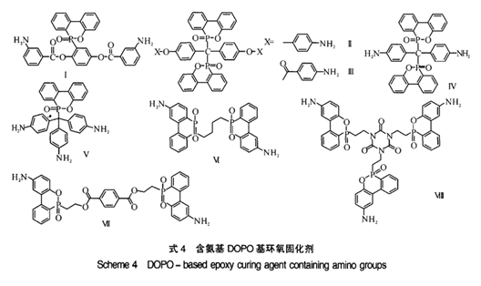 在DOPO衍生物中引入羟基、羧基,氨基等能促使环氧键打开的活性基团,可得到具有阻燃活性的环氧树脂固化剂。它们与环氧树脂发生固化反应生成阻燃化的环氧树脂。通过分子结构设计,不同磷含量、热稳定性、刚性和不同固化温度要求的DOPO基环氧树脂固化剂被合成出来。目前该类化合物已在覆铜板环氧树脂等领域成功应用并显现出良好的发展前景。