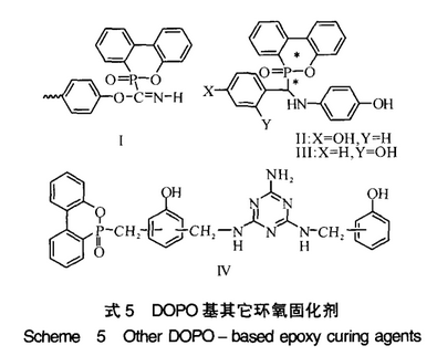 利用DOPO与氰酸酯的加成合成了含磷氰酸酯环氧树脂固化剂(式5,Ⅰ)。由Ⅰ阻燃的环氧树脂磷质量分数<1.6%时UL-94测试可达V-0级,自固化和氰酸酯 – 环氧树脂固化体系的Tg分别为204℃和161℃, 5%热分解温度分别达到463℃和439℃,并具有较高的耐湿性和高的介电常数。2007年,利用DOPO与亚胺的加成反应合成了新型含2个酚羟基和1个仲胺基团的三官能团环氧树脂固化剂(式5,Ⅱ,Ⅲ)。并将Ⅱ,Ⅲ用于CNE的阻燃研究。研究结果表明,Ⅱ,Ⅲ阻燃的环氧树脂,磷质量分数为0.9%时,UL —94测试都可达V—1级,磷质量分数为1.2%时,UL —94测试都可达V—0级。N—P协同效应可以解释Ⅱ,Ⅲ的高阻燃性能。合成了带有三嗪结构的含羟基和氨基的三官能团环氧树脂固化剂ODOPM—MPN(式5,Ⅳ)。该阻燃剂用于环氧树脂即可达到UL—94 V—0级。阻燃后的材料不但具有良好的机械性能、阻燃性和热稳定性,而且燃烧时具有低烟性能。