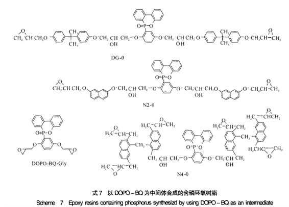 DOPO - BQ作为环氧树脂固化剂显示了优异的阻燃性,以DOPO – BQ为中间体可合成一系列含磷阻燃环氧树脂单体(见式7)。PN固化的DOPO – BQ –Gly环氧树脂,磷质量分数由0提高至1.03%时,700℃成炭率由0可提高至11%,LOI由19可提高至34,UL – 94测试达V -0级。因使用溴系阻燃剂TBBA时,溴质量分数达7.24%才能达到相同的阻燃效果。DOPO – BQ – Gly对含螺环原酸酯悬挂基团聚丙烯酸酯也有一定的阻燃效果。利用DOPO – BQ与其他环氧树脂的反应合成了双酚A型(式7,D – 0)和含萘环结构的环氧树脂(式7,N2 – 0,N4 -0),3者分别用DDS固化,DG – 0/DDS体系,磷质量分数为2.4%,LOI为32;N2– 0/DDS体系,磷质量分数为2.6%,LOI为33,;N4 – 0/DDS体系,磷质量分数为1.4%,LOI为35;3者UL-94测试都达到V- 0级。而使用相应的溴系阻燃剂质量分数13.4%~22.7%时,才能达到相同阻燃效果。