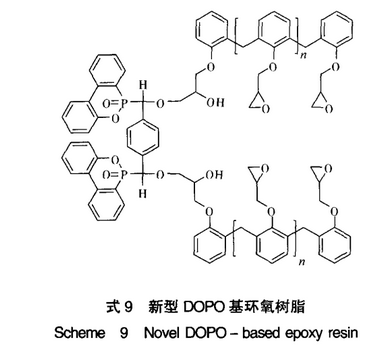 利用对苯二甲醛与DOPO的加成,然后再与酚醛环氧树脂反应制备了新型DOPO基环氧树脂(式9)。所得的环氧树脂分别用DDM和4,4‘ – 二氨基二环己基甲烷(PACM)固化,在较低的磷含量下(分别为1.01%和1.44%时),UL – 94测试可达V – 0级,LOI分别为29.1和29.5;T g随磷含量的增加有所下降,但仍保持在较高的温度(>169℃)。由于该类阻燃环氧树脂具有优异的阻燃性和热稳定性,可能会成为DOPO – BQ的替代产品之一用于工业生产。
