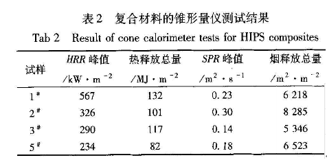 HRR是指材料被点燃后单位面积的热释放速率,是表征火灾强度的重要性能参数。由图1和表2看到,纯HIPS(试样1#)的HRR曲线具有尖锐的峰值,材料在点燃后在很短的时间内达到很大的HRR,放出大量的热。而加入阻燃剂后(试样2#、3#、5#)的HRR曲线没有尖锐的峰值,燃烧过程进行的较缓慢。与纯HIPS相比,ZB- RPM阻燃的HIPS复合材料的HRR峰值下降最多,热释放总量最少。 ZB- RPM阻燃的HIPS的HRR峰值由纯HIPS的567Kw/m2降低为234 Kw/m2,比单独加入RPM或ZB分别下降28.3%和19.5% 。上述实验表明,ZB与RPM复合使用对HIPS复合材料阻燃性能有较大提高,二者之间具有显著的协同阻燃效果。
