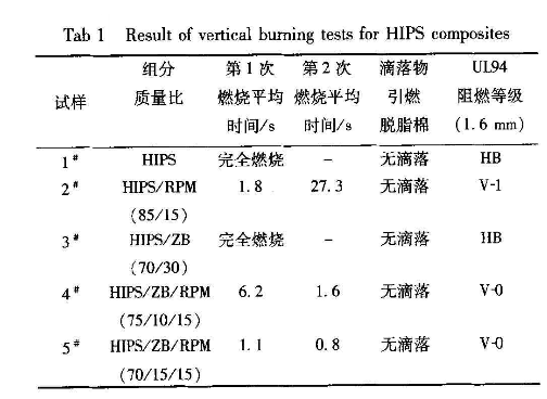 从试样4#和5#看到,使用ZB与RPM复合阻燃HIPS,材料的燃烧性能得到了明显改善,当加入10%的ZB和15%的RPM后,垂直燃烧等级已达到UL94 V – 0级别,进一步增加ZB用量时,材料的燃烧性能更优异,可达到离火即灭的状态,表明ZB与RPM有明显的协同阻燃作用。