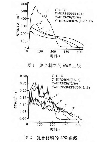 2)ZB与MRP复合阻燃HIPS,可有效降低材料的热释放速率和烟释放速率,加入15%ZB和15%RPM,HIPS材料的HRR由567 kW/m2降为234 kW/m2,SPR由0.23m2/s降为0.18m2/s 。