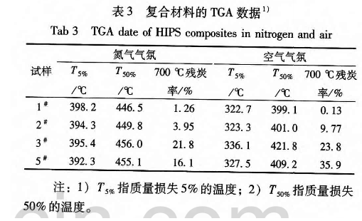 在阻燃聚合物材料中,经常通过TGA试验获得材料热降解过程的相关数据,以此来研究材料的阻燃机理。图3和图4为试样1#~3#、5#复合材料分别在氮气和气氛和空气气氛下的TGA曲线,表3列出了材料相应的起始分解温度、半衰期温度和残炭率参数。