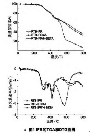 RTB-IFR的加入提高了PP的热稳定性,降低了PP的热分解速率,从而降低了PP的易燃性。因为含IFR的PP在燃烧时,RTB-IFR通过酯化和交联反应,形成具有较高热稳定性的炭层,该炭层在PP表面形成一个屏障,阻止裂解产生的可燃性气体向火焰表面扩散,起到隔热、隔氧的作用。而在IFR中加入分子筛进一步增加了PP的热稳定性,降低了PP的热分解速率,残炭量提高,使膨胀炭层成为更好的屏障,减缓了基材与外界的热量交换,这正是分子筛使IFR-PP阻燃性能提高的直接原因。