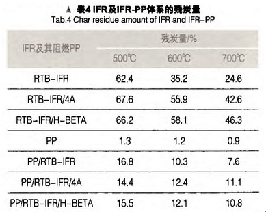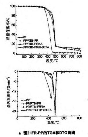 RTB-IFR的加入使PP的最大热失重峰所对应的温度提高,由原来的437.8℃提高到485.5℃。而在RTB-IFR中添加分子筛后,其阻燃PP的最大热失重峰所对应的温度变化不大,残炭量比没加分子筛的阻燃PP有所提高。PP/RTB-IFR材料700℃的残炭量为7.6%,加入4A和H-BETA分子筛后,分别为11.1%和10.8% 。