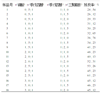 通过实验发现,影响生成物MPP残炭率与膨胀度的主要因素为3种物质的量比,表1为原料物质的量比对产物残炭率的影响,从中可以看出:当3种物质的量比在2~2.5 : 1:1.8~2.2时可使产物残炭率最高。