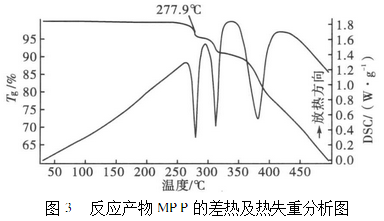 图3为物质n (H3PO4):n (PER): n (MEL)=2~2.5 : 1:1.8~2.2,反应时间 5 h,反应温度120℃时MPP的差热及热失重分析。可以看出:MPP具有很好的热稳定性,第1个吸收峰在280℃左右,对应的吸热峰为MPP吸热分解生成偏磷酸盐的过程;第2个吸热峰在310℃左右,对应于分解生成焦磷酸盐的过程;第3个分解吸热峰在380℃左右,对应于生成聚磷酸盐的过程,在400~500℃时,样品急剧分解失重,最终形成一种(P—N—C—O)x协效的物质。MPP在277.9℃左右开始分解,说明可以用于绝大部分塑料的加工;而其降解温度300~500℃左右刚好与高聚物降解温度重叠,即为发生膨胀阻燃的有效温度。