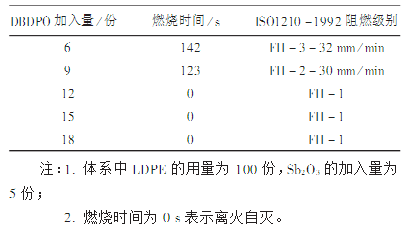 DMDPB的阻燃增效作用国外研究较多,关于DMDPB的加入对LDPE各项性能的影响,我们将另有文章发表。本文只选择LDPE/ Sb2O3 /DBDPO(质量比)=100 /5 /3体系作为基质(LDPE为100份),加入1份DMDPB,进行相关研究。燃烧试验结果见表3 。