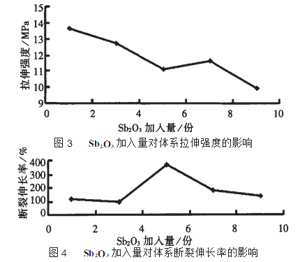 由图3可知,随着Sb2O3加入量的增加,体系的拉伸强度是呈下降趋势的;而从图4中看到,在Sb2O3 加入量达到5份时,体系的断裂伸长率达到最大值。