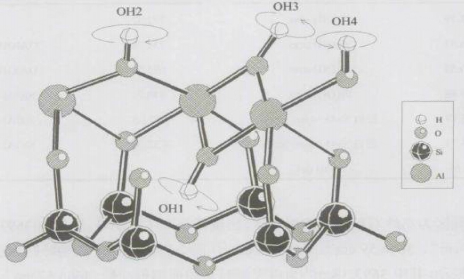 高岭石理论化学组成为A120:39.0%,Si4O246.4%,H2013.6%。它含有吸附水、层间水和结晶水。表面有许多活性基因,如Si—O。、AI—O。、AI—OH等,其化学成分一般比较简单,只有少量Mg、Fe等代替八面体重的AI,AI、Fe代替si数量很少。高岭石因晶格边缘存在断键,可引起少量的阳离子交换。