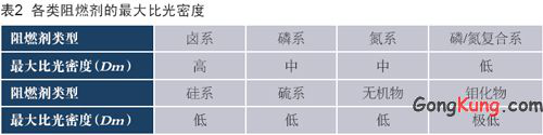 在设计无烟阻燃配方时,要尽可能选择低烟的阻燃剂,卤/锑阻燃体系和包覆红磷都增加发烟量和有毒气体的扩散。因此,在使用溴类阻燃体系时,最好同时加入抑烟剂。常用各类阻燃剂自身的发烟性如表2所示。