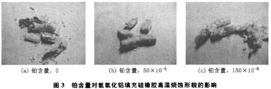 硅橡胶具有高温成炭性,即在高温条件下能形成具有一定形状的陶瓷化残留物(主要含硅、氧、碳和其他无机元素),能起到阻隔热量传输,提高大分子热稳定性,减缓可燃性小分子和氧气的传入,有利于阻燃作用;但通常形成的残留物的量、强度和连续性往往不够。若能有效提高硅橡胶燃烧后的残余物质的量、强度和连续性,则会大大提高硅橡胶的阻燃效果。本研究主要考察了铂化合物分别与氢氧化铝及惰性填料并用、白云母、低软化点玻璃、不同硫化体系和不同填料对硅橡胶燃烧后残留物的形成及阻燃效果的影响。