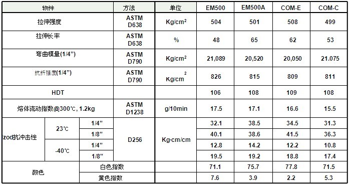 • EM500室温下的冲击强度相比于EXL稍差,但低温冲击强度比罗门哈斯EXL 2620及日本钟渊M521好.