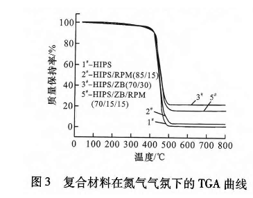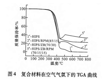 由此可见,单独使用ZB或RPM,由于促进成炭性能有限,阻燃效果不佳,二者复合后,通过相互作用可以大幅促进HIPS成炭,形成有效的隔热隔氧碳层,从而使HIPS复合材料的阻燃性能得到明显改善,是典型的凝聚相阻燃机理。