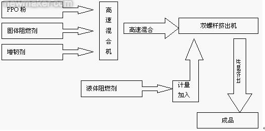 按照质量份数,将称量好的PPO原粉、固体阻燃剂、HIPS、增韧剂、抗氧剂倒入高速搅拌机混合2~3分钟,然后将预混物在双螺杆挤出机进行塑化、混炼,同时通过液体计量泵把液体阻燃剂加入到机筒内,通过螺杆的分布混合使液体阻燃剂均匀分散到PPO/HIPS合金内,最后挤出造粒。工艺流程如下: