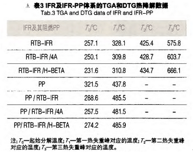RTB-IFR的加入提高了PP的热稳定性,降低了PP的热分解速率,从而降低了PP的易燃性。因为含IFR的PP在燃烧时,RTB-IFR通过酯化和交联反应,形成具有较高热稳定性的炭层,该炭层在PP表面形成一个屏障,阻止裂解产生的可燃性气体向火焰表面扩散,起到隔热、隔氧的作用。而在IFR中加入分子筛进一步增加了PP的热稳定性,降低了PP的热分解速率,残炭量提高,使膨胀炭层成为更好的屏障,减缓了基材与外界的热量交换,这正是分子筛使IFR-PP阻燃性能提高的直接原因。