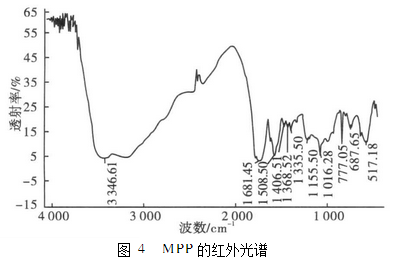 将合成时原料配比,反应时间 5 h,反应温度120℃的MPP样品进行红外光谱分析,结果如图4所示。