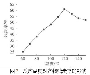 图2为第二步原料物质的量比 n (H3PO4):n (PER): n (MEL)=2~2.5 : 1:1.8~2.2,反应时间 4 h时,反应温度对产物残炭率的影响;当温度控制在100~120℃时,反应较完全,此时残炭率最高。