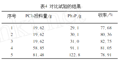 为了工业化需求,对原材料采用工业试剂规格进行试验,以提供有用数据。原材料为:工业甲苯经5A分子筛脱水后使用;工业氯苯含量≥99%,经5A分子筛脱水后使用;金属钠含量≥99.5%;三氯化磷含量≥95.5% 。合成方法如前,结果见表4 。