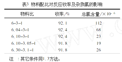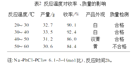 理论上钠、氯苯、三氯化磷的比例是6—3—1,实验中发现,金属钠和氯苯的过量有两个缺点,一是过量未反应的钠渣和苯钠不便处理;二是过量的氯苯裹在产品中较难除去,导致产品总氯含量不合格,因此,物料配比影响收率和产品的重要指标,影响产品催化性能的好坏,按产品要求总氯含量应小于25×10-6为合格品。产品中总氯主要来源于未作用的氯苯、盐泥和三氯化磷。盐泥和三氯化磷属无机氯,可用蒸馏水多次洗涤产品除去,氯苯为有机氯,可用蒸馏水多次洗涤产品除去,氯苯为有机氯,用洗涤的方法很难除去,必须控制用量和多次重结晶纯化才有效果,多次重结晶又会影响收率,因此,反应越不完全或氯苯过量,越不易得到合格产品,必须选择好物料配比、反应条件、温度等因素。该反应最佳的物料比为6.1—3—1(mol比)。