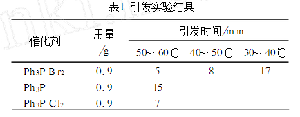 自由基反应存在反应引发的问题,合适的催化剂及用量,引发条件的选择控制将直接影响产品质量、收率及安全问题,实为反应的关键,经过试验我们选择了二溴三苯磷做催化剂,同时与Ph3P 和Ph3PC I2做了对比,结果见表1。