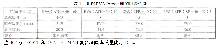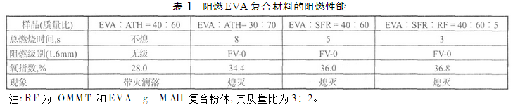 在上述EVA/SFR体系基础上,为改善其阻燃材料的强度,加入3份OMMT,2份EVA – g – MAH,所制得的阻燃EVA力学性能可满足电线电缆的应用要求。其阻燃性能为FV – 0 ,与EVA/SFR体系相比,氧指数略有提高,总燃烧时间缩短。这可能是由于OMMT的片层结构具有隔热隔氧作用,同时EVA – g – MAH提高了阻燃剂与基体树脂的相容性,使得阻燃剂粉体颗粒更均匀分布在树脂中,减少了分子链间的自由体积,限制了分子链的活动能力,抑制主链的裂解,进而提高了阻燃性能。