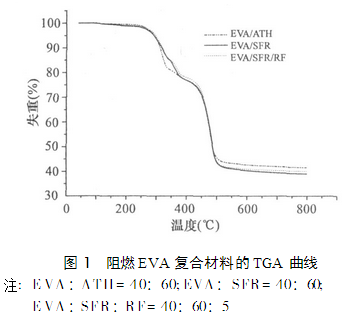 图1是用阻燃材料的热失重曲线,图中3种不同配比的EVA/ATH降解过程呈现出3个过程:240 ~ 330℃温度范围对应于ATH受热分解失去结晶水;在330 ~ 400℃之间,对应醋酸乙烯酯侧链断裂;在400℃以上,EVA中聚乙烯主链开始断裂,阻燃材料分解完毕时,其残余率为41.5%。与EVA/ATH相比,EVA/SFR和EVA/SFR/RF有相似的失重曲线,但在300~330℃之间的失重速率变慢,这可能是因为ATH添加量减少,而ADP在此温度范围分解相对较少,致使材料的失重速率放缓;而在330 ~ 360℃之间,材料失重速率加快,则可能是由于ADP分解加速,同时生成的聚偏磷酸也促进ATH的脱水过程。在以上两个温度区间内,EVA/SFR和EVA/SFR/RF的失重相对于EVA/ATH更小,这可能是阻燃剂中ADP的加入减少了ATH的含量,相对应地减少了体系释放的结晶水。EVA/SFR和EVA/SFR/RF的烧剩残余率分别为39%和40.1%,两者均低于EVA/ATH,由于后者含有更多无机粉体;协效阻燃体系中ATH比例减少,是残余AI2O3相对减少的缘故。