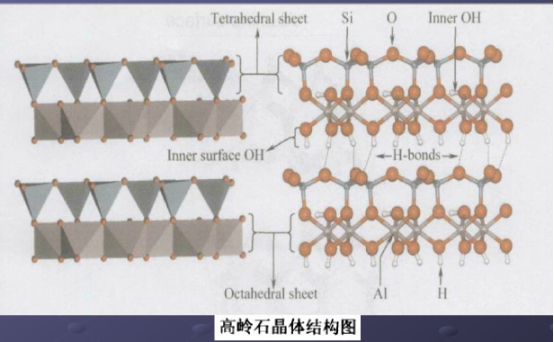 高岭石理论化学组成为A120:39.0%,Si4O246.4%,H2013.6%。它含有吸附水、层间水和结晶水。表面有许多活性基因,如Si—O。、AI—O。、AI—OH等,其化学成分一般比较简单,只有少量Mg、Fe等代替八面体重的AI,AI、Fe代替si数量很少。高岭石因晶格边缘存在断键,可引起少量的阳离子交换。