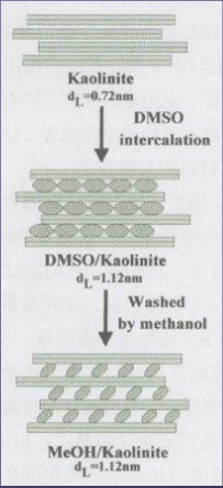 高岭石层间作用力较强,不含可交换性阳离子,无膨胀性,与其他层状粘土矿物相比,较难与有机化合物发生插层反应。仅有一些极强性有机小分子,如二甲基亚矾(DMSO)、甲酰胺(FA)、N—甲基甲酰胺(NMF)、脲(Uera)、联氨(Hydrazine)等可以直接插入到高岭石层间。而其它有机分子则可以采用“置换插层法”,即置换预插层在高岭石层间的上述有机小分子而制备相应的有机插层复合物。大量研究表明,高岭土经过置换插层制备的高岭石——甲醇有机复合物,可以作为进一步置换插层的前驱体,具有广泛的通用性。由此可以制备出多种有机插层复合物。高岭土多次插层一去插层(脱嵌)后,具有较高的反应活性,能够轻易地插入二价碱土金属和过渡金属等,用这种方法有望制备出高活性的催化剂。