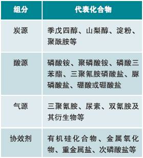 IFR主要由三部分组成:第一部分是酸源又称脱水剂或炭化促进剂。通常为无机酸或无机酸化合物,如磷酸、硫酸、硼酸、磷酸铵盐、磷酸酯及聚磷酸铵(APP)等,可与树脂作用,促进炭化物的生成;第二部分是炭源又称成炭剂,主要为一些含碳量较高的多羟基化合物或碳水化合物,如淀粉、季戊四醇(PER)及其二聚体和三聚体等;第三部分是气源又称发泡源,可释放出惰性气体,为含氮类化合物,如尿素、三聚氰胺(MEL)、双氰胺、APP等。