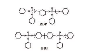 BDP和RDP是近年来开发出的新型无卤环保有机磷类阻燃剂,其结构式如上图所示。与传统有机磷阻燃剂相比,它们具有分子量大、热稳定性高、挥发性低以及阻燃效率高等特点。BDP在热稳定性及水解稳定性方面比RDP略为优越,作为添加型阻燃剂,主要用于热塑性工程塑料如PC/ABS共混物、 聚乙烯及泡沫聚氨酯中,表现出十分优异的阻燃效果。