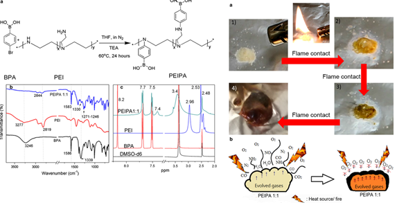 中国科技大学的Shuk Ying Chan教授在Cellulose上发表了题为“A novel boron–nitrogen intumescent flame retardant coating on cotton with improved washing durability”的文章。在本文的工作中,作者设计、合成了一系列硼-氮聚合物(PEIPAs),为棉织物阻燃整理提供了绿色的选择。文章以苯硼酸(PA)为原料,通过1H-NMR和FTIR分析证实了一种有机硼化合物-苯基硼酸(PA)。热重分析表明,该聚合物的摩尔比为1:1的乙基胺:PA (PEIPA 1:1),呈现出最佳的热氧化稳定性。通过一种简单的在丙酮介质中吸收的简单浸渍方法,可以很容易地将PEIPA 1:1应用于棉织物上。具有33.8 wt%附加组件的织物具有自熄能力。SEM分析了处理后织物的焦样形态,通过膨胀型阻燃机理揭示了涂层的防火性能。TGIR分析表明,涂层织物在可燃挥发物生产中有显著的降低。通过新型无甲醛交联处理,进一步提高了涂层的耐洗性。添加30wt %阻燃剂的织物,新型耐水洗涂层在重复洗涤前后的LOI值分别为29.6和23.2%。锥形量热分析表明,PEIPA 1:1处理的样品和交联样品(PEIPA 3:1/NeoFR处理)的总热释放量分别下降了30.3和45.5%。烟气分析表明,经处理的织物CO2/CO比值显著降低,说明其在气相中的有效抑制作用。这种新型涂层,易于合成,易于使用,低浪费,为纤维素产品替代有毒卤素阻燃剂提供一种选择。