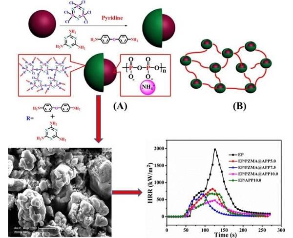 来自中国科技大学Shuilai Qiu团队和香港城市大学合作在Journal of hazardous materials上发表了题为“Melamine-containing polyphosphazene wrapped ammonium polyphosphate: a novel multifunctional organic-inorganic hybrid flame retardant”。这个工作设计合成了一种新型多功能有机-无机杂化、含三聚氰胺的聚磷酸铵多磷酸铵(PZMA@APP),并将其作为一种高效阻燃剂。由于交联聚磷酸盐部分,PZMA@APP在EP复合材料中表现出了高阻燃效率和烟气抑制作用。添加10.0wt%的PZMA @ APP的样品通过UL-94 V-0评级,值得注意的是,添加PZMA @ APP可显着降低EP的火灾危险,例如,峰值放热率最大降低75.6%,总放热量最大减少65.9%,同时烟气产生率较低,更高的石墨化炭层。特别是,与纯APP相比,添加PZMA @ APP不会使机械性能变差。本文证实了含三聚氰胺的聚磷腈的加入可以显着提高焦炭层的质量,从而使PZMA @ APP的阻燃效率更高。