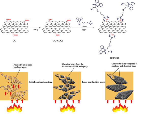 为了使聚合物具有阻燃性,在聚合物基体中引入了各种阻燃剂。磷阻燃剂作为一种重要的无卤阻燃剂,其高效能引起了广泛的关注。为了进一步提高PFRs的效率,通常采用与其他阻燃剂(物理混合物或化学组合)的协同系统。石墨烯是一种具有优异屏障性能的二维碳材料,已被引入到聚合物材料中,以增强其阻燃性作为一个物理碳源,石墨烯可以减少在燃烧过程中可燃气体的热释放和抑制其转移,然而,单独使用石墨烯作为阻燃剂,垂直燃烧测试等级和极限氧指数并未明显提高。而氧化石墨烯表面有许多含氧官能团,因而可以对其进行化学修饰,以提高其在聚合物中的相容性和聚合物机械性能、阻燃性能等。